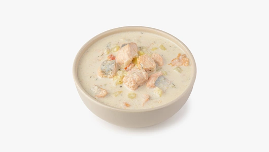 Наваристая уха по традиционному финскому рецепту из нежного филе горбуши для согревающего обеда. Мы добавили картофель, лук и томаты, а также сливки, чтобы суп получился бархатистым и чуть сладковатым. Куриный бульон оттеняет вкус рыбы, а лимонный сок и укроп добавляют свежий акцент. Подогрейте блюдо и подайте на стол с чёрным хлебом. В кухне северных народов горячая еда особенно ценится, поэтому уха получается сытной и очень вкусной. Такой обед поможет быстро согреться и восстановить силы.