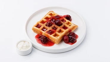 Пышные вафли с ванильным оттенком подаются вместе с творожным кремом и вишнёвым компоте. Их можно слегка подогреть, чтобы они стали тёплыми и ароматными. Кисло-сладкие ягоды в пряном сиропе добавляют яркий акцент. Крем из творожного сыра делает лакомство ещё более нежным и гармонирует с ягодным соусом. Выложите вафли на большую тарелку, налейте чашечку крепкого кофе или травяного чая и наслаждайтесь атмосферой уютного кафе или небольшого ресторана, где каждый десерт подают как уникальное произведение искусства.