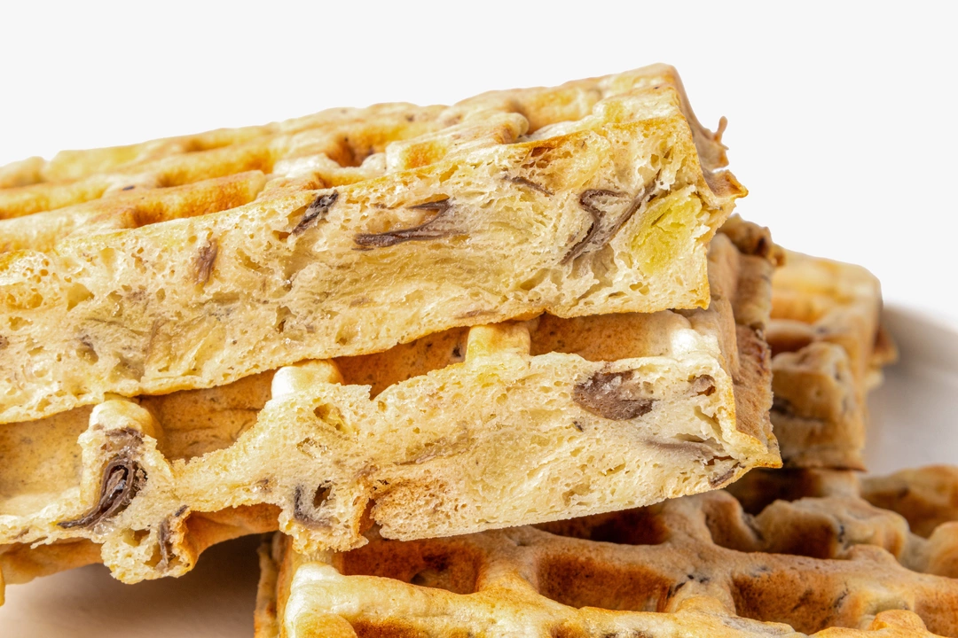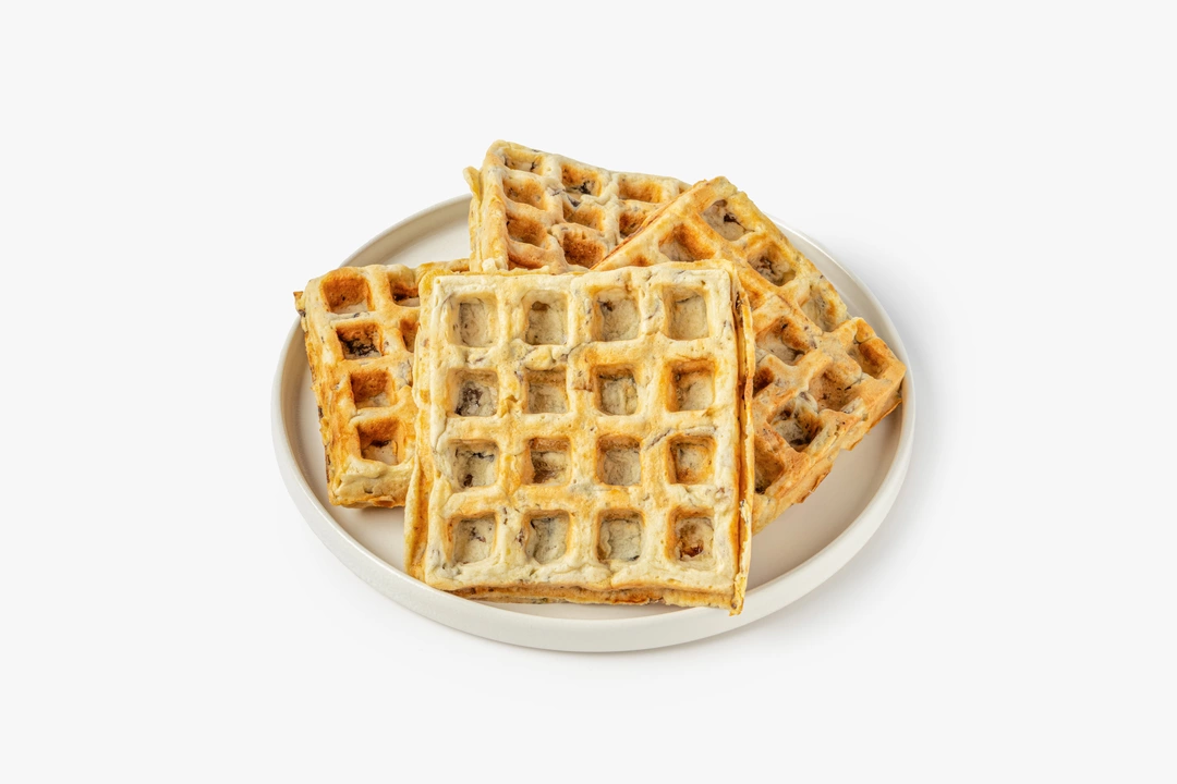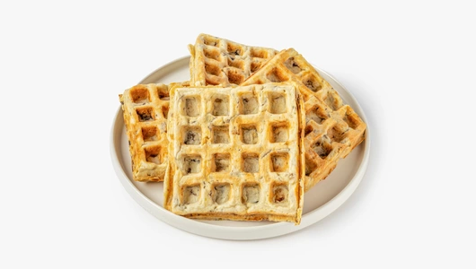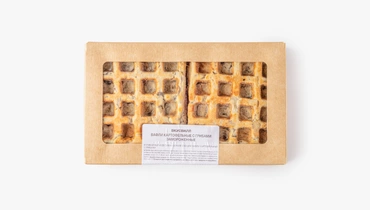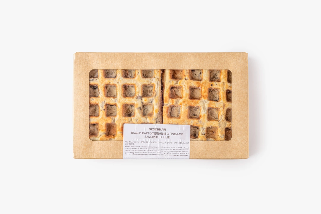 Румяные и пышные вафли на картофельной основе подойдут для сытного завтрака или перекуса в течение дня. Они получаются мягкими и плотными благодаря добавлению в тесто отварного картофеля, а обжаренные шампиньоны придают им насыщенный грибной вкус. Это замороженный полуфабрикат, перед подачей вафли нужно разогреть в микроволновой печи, духовке или тостере, следуя инструкции на упаковке. Их можно дополнить любыми несладкими топпингами или сметаной. Продукт не содержит искусственные ароматизаторы.