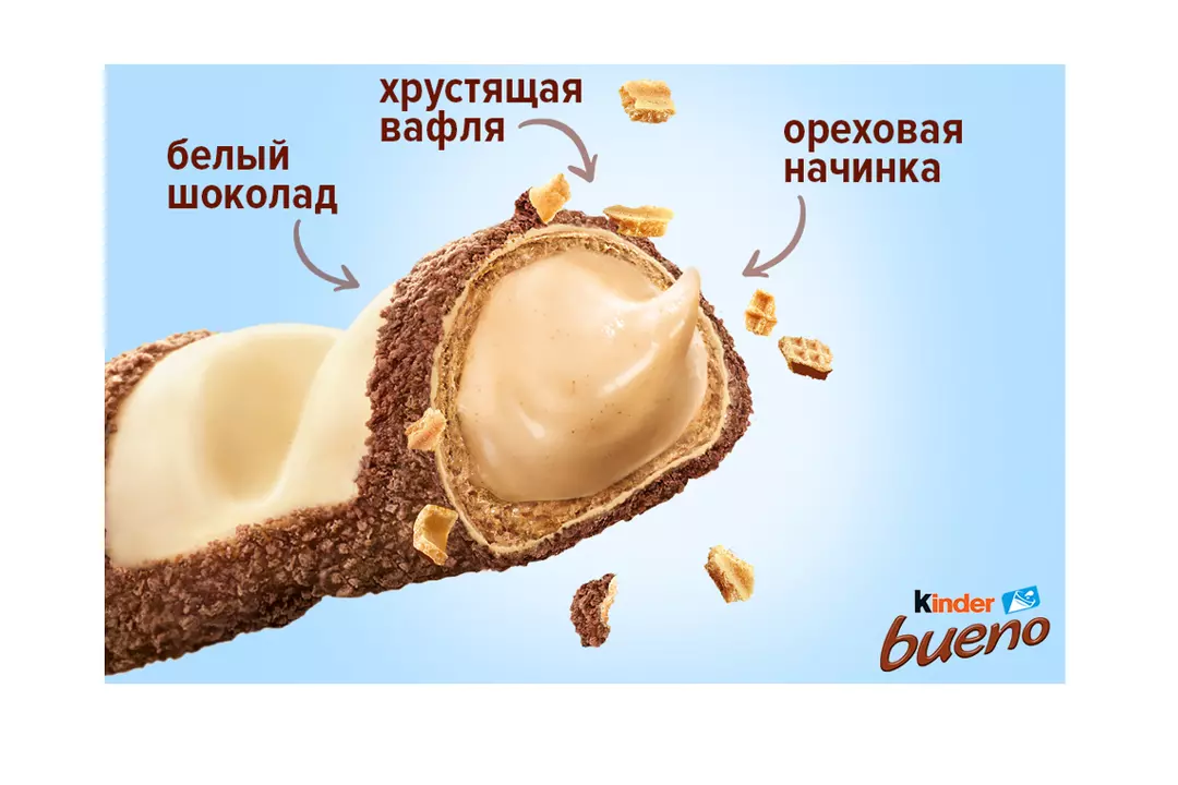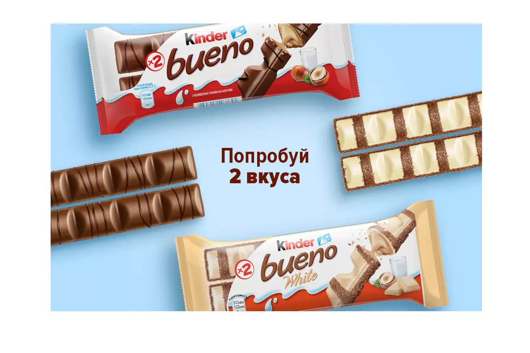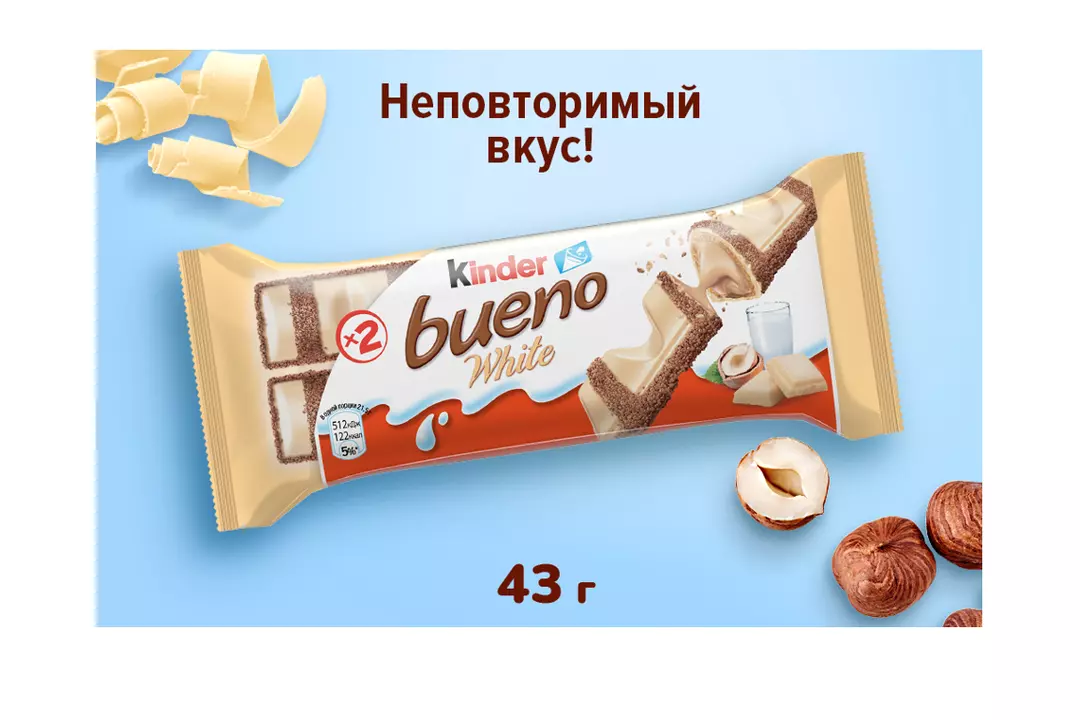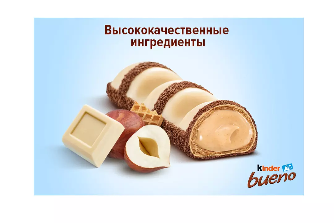 Kinder Bueno — это изысканное сочетание хрустящей вафли, нежного орехового крема и белого шоколада. Каждый шоколадный батончик упакован индивидуально, поэтому идеально подходит для приятного перерыва наедине с собой. Киндер Bueno создан для того, чтобы дарить удовольствие. Он порадует насыщенным вкусом, ароматом и нежной текстурой, которая тает во рту. Kinder Bueno — это отличный способ побаловать себя. Скажи Bueno наслаждению! Условия хранения: Хранить при температуре от 15°C до 22°C и относительной влажности не более 65%. Страна-производитель Польша