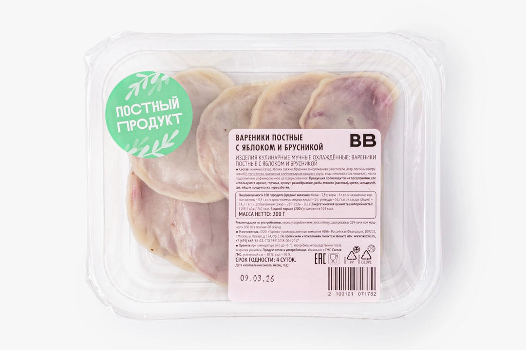 Нежные вареники с яблочно-брусничной начинкой разнообразят постное меню. Мы приготовили тесто на воде без яиц и молока, чтобы оно оставалось мягким и эластичным. Измельчённые яблоки и бруснику смешали с сахаром, агар-агаром и добавили пектины, чтобы начинка получилась густой и не вытекала. Отварите вареники и подавайте их с растительными сливками, ягодным соусом или просто с посыпкой из сахарной пудры. Они приготовлены с теплом и заботой, чтобы вы не отказывались от любимых блюд