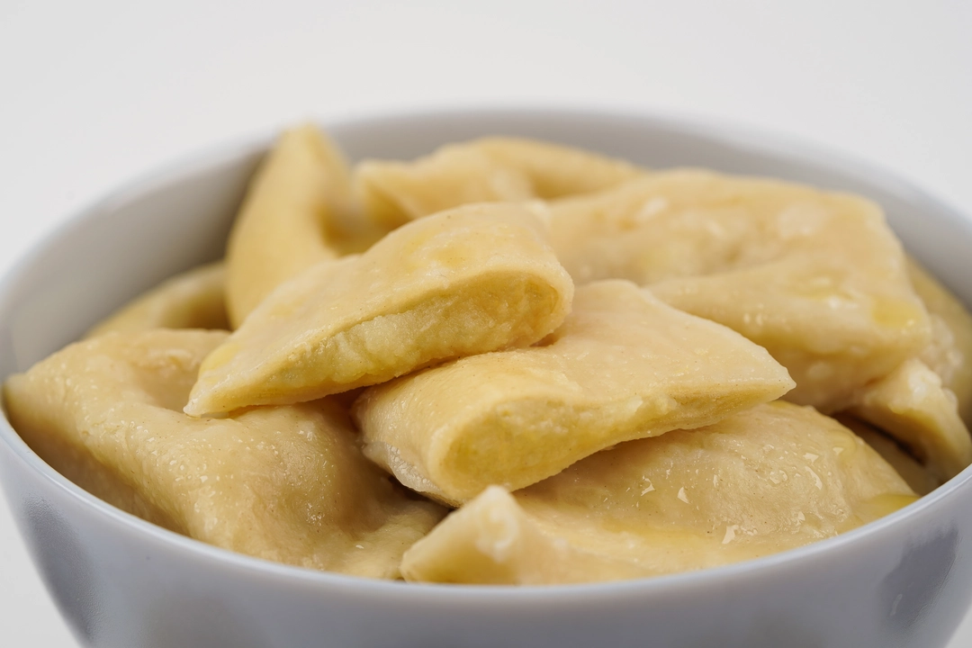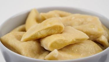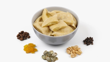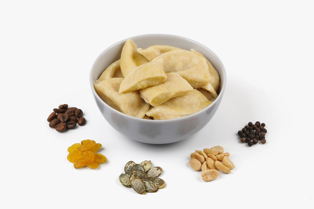 Пусть сюрпризы в наступающем году будут только приятными. Но если вам хочется заглянуть в будущее уже сейчас, можно по старой доброй традиции погадать на варениках. Мы приготовили их по-домашнему: из упругого теста и с начинкой из нежного картофеля. В варениках вас может ждать сюрприз: душистый перец горошком — к острым ощущениям, тыквенная семечка — к богатству, изюм — к любви и романтике, ядра арахиса — к крепкому здоровью, а зерно кофе — к большой удаче. Если же топпинга в вашей порции не оказалось, не спешите огорчаться, ведь даже обычные вареники вкусные и сытные.