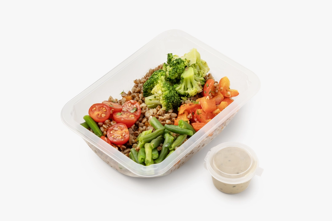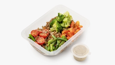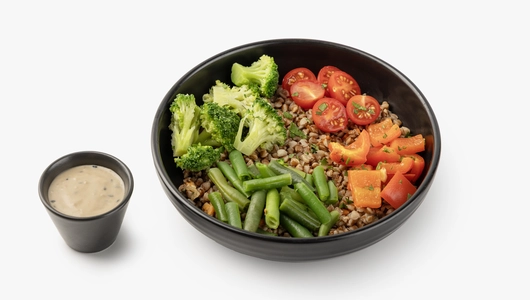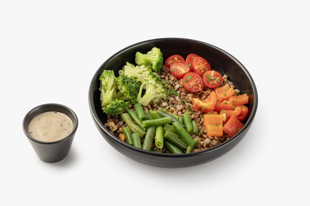 Рассыпчатая гречка с пассерованными морковью, луком и петрушкой выступает в качестве основы этого аппетитного блюда. К ней мы добавили соцветия брокколи, стручковую фасоль и сладкий перец для лёгкого хруста, а томаты черри — для сочности. Постная кунжутная заправка на основе соевого соуса и кунжутного масла объединяет компоненты, добавляя деликатную солоноватость и ореховый оттенок. Блюдо приедет горячим — его можно сразу подавать, чтобы оценить сочетание тёплой гречки и овощей с насыщенной заправкой.