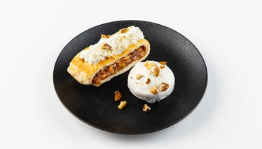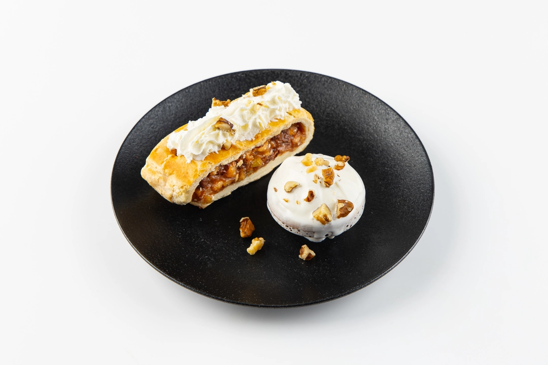 Классический штрудель с начинкой из печёных яблок с корицей. Лёгкая фруктовая кислинка гармонирует со сладостью изюма. Шарик сливочного пломбира создаёт выразительный контраст с тёплым пирогом. Сверху добавлена шапочка из взбитых сливок и посыпка из дроблёного грецкого ореха. Блюдо доступно для самовывоза из магазинов с зоной кафе. Его тоже можно выбрать Любимым продуктом и покупать с приятной скидкой.