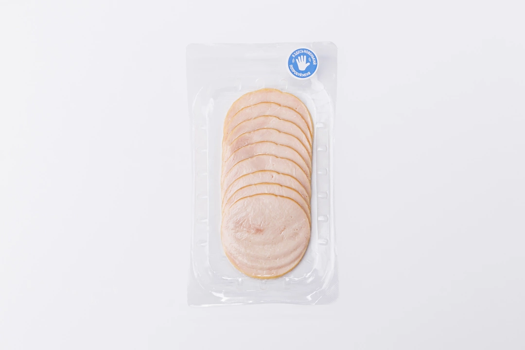 Ветчина приготовлена из филе индейки с добавлением молочного протеина, поэтому она отличается лёгким вкусом и высоким содержанием белка. Пшеничные волокна придают плотную структуру, при этом ломтики остаются нежными. Ветчину можно подать с хлебом и овощами, добавить в сытные салаты или использовать для тёплых закусок.