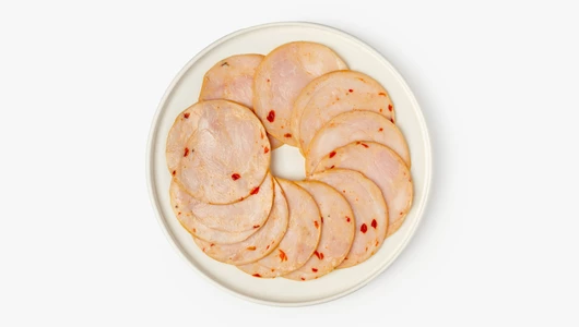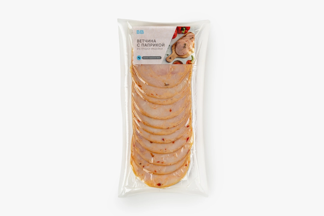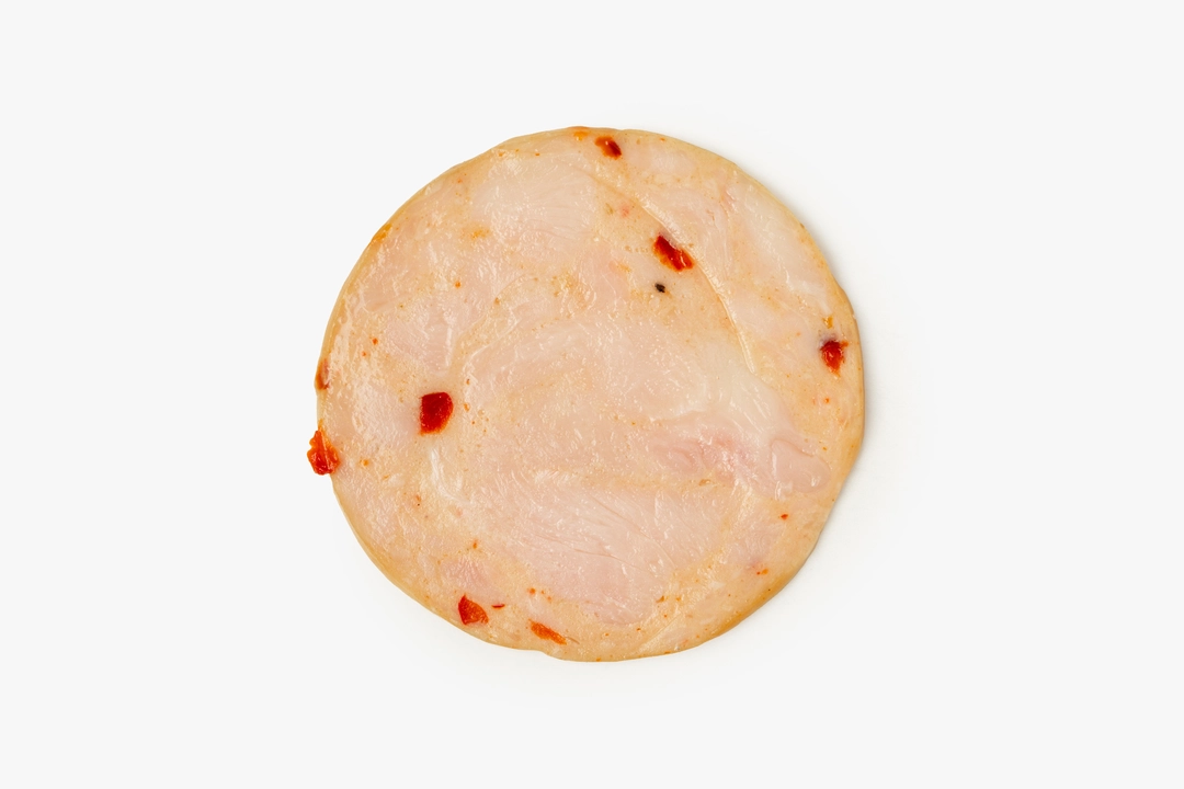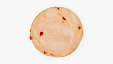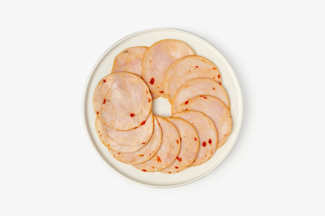 Ломтики варёной ветчины из индейки. Нежный вкус птицы обрамлён тонкой пряностью сладкого перца, текстура умеренно плотная, волокнистая. Идеально к завтраку и для домашней пиццы.