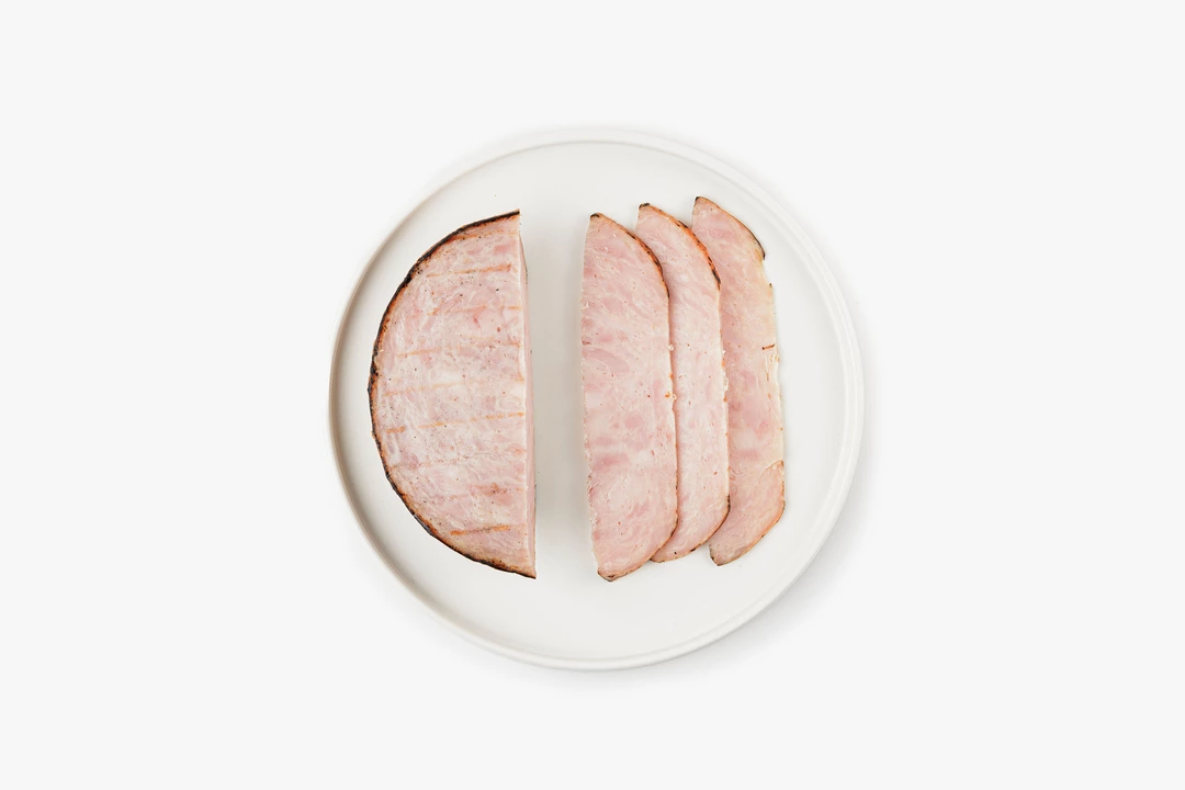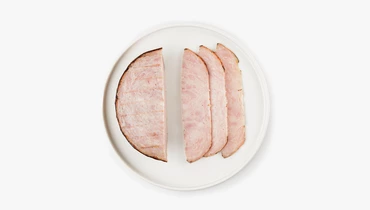 Сытная куриная ветчина с аппетитными подпалинами от гриля. Сочетание филе и бедра птицы делает её особенно сочной, а молоко добавляет нежности и мягкости. Небольшое количество специй придаёт мясу классический вкус и аромат. Готовый продукт подходит для приготовления бутербродов и сэндвичей с зеленью и овощами. Ветчину можно подать как самостоятельную холодную закуску или в составе мясной тарелки.
