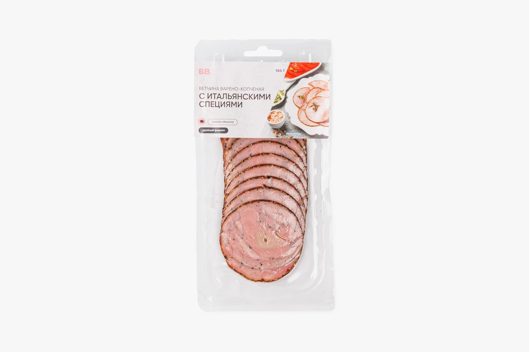 Нежная ветчина из свиной лопатки приготовлена с цитрусовыми экстрактами и миксом специй: кардамона, чёрного и белого перца, мускатного ореха и корицы. Варёно-копчёный способ приготовления придает мясу насыщенный аромат. А вкус становится более ярким и многогранным благодаря декоративной чесночно-пряной обсыпке. Подходит для нарезки, добавления в салаты или бутерброды. Попробуйте подать с сыром, свежими овощами или зерновым хлебом. Сытный и ароматный вариант для любителей мясных деликатесов.