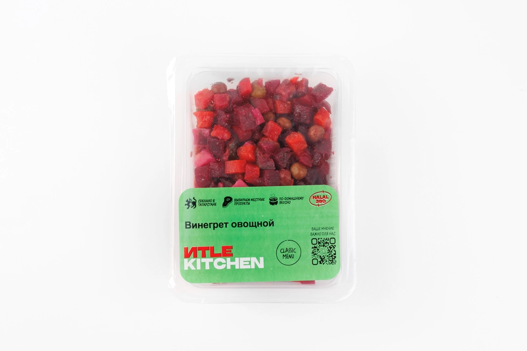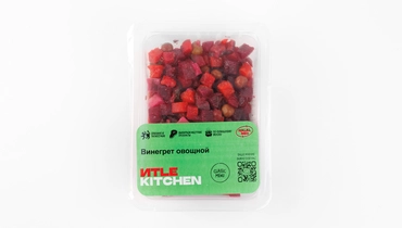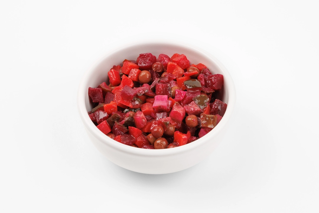 Классический винегрет с узнаваемым вкусом и лёгкой кислинкой маринованных огурцов. В составе — отварные свёкла, картофель и морковь, немного зелёного горошка и подсолнечное масло, которое объединяет вкус всех ингредиентов. Блюдо соответствует требованиям халяль.