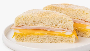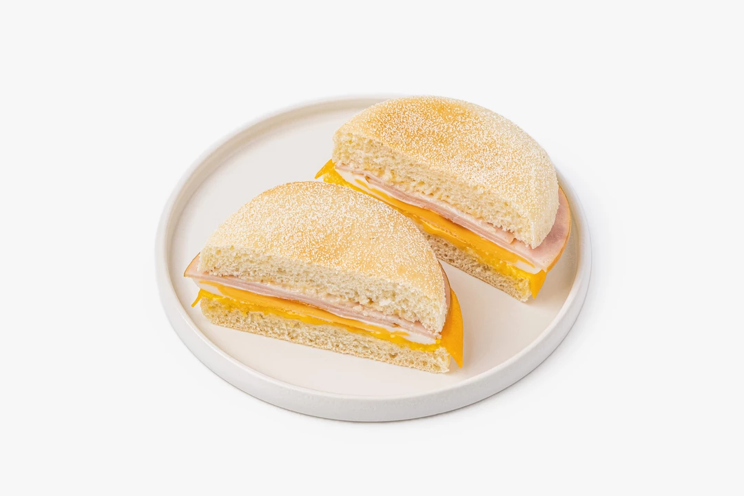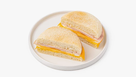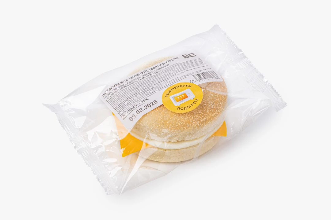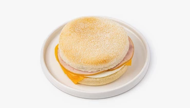 Мягкий пшеничный маффин с нежным мякишем и начинкой из яйца, ветчины и сыра чеддер. Ветчина даёт мясной акцент, чеддер добавляет насыщенный сырный вкус, а яйцо делает этот утренний бургер более сытным. Немного соуса смягчает начинку и связывает все слои между собой. Такой маффин удобно взять с собой на завтрак или перекус — он хорошо насыщает и получается особенно аппетитным при разогреве, когда сыр слегка плавится, а булочка становится ещё более мягкой и ароматной.