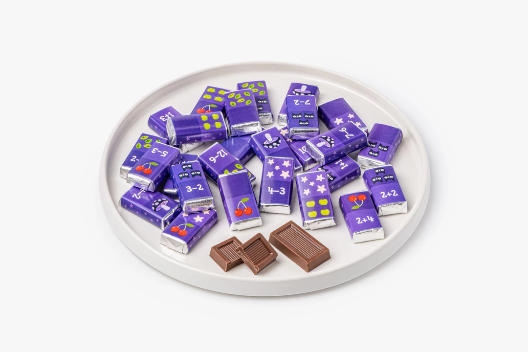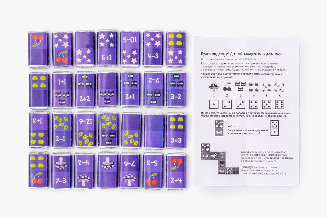 Настоящая съедобная игра, которая понравится и детям, и взрослым. В подарочной коробке вы найдёте сладкие фишки домино из молочного шоколада и правила. Каждая мини-шоколадка обёрнута в фантик с ярким изображением игральной плашки. Вместо точек на них нарисованы сказочные персонажи и простые математические примеры. Чтобы сделать ход, нужно соединить одинаковые картинки или решить задание и подобрать костяшку с правильным ответом. Такой формат тренирует счёт в игровой форме. После успешной партии шоколад можно съесть — это приятная и вкусная награда для игроков. Набор станет неожиданным сюрпризом для детей, которые любят и математику, и сладости.