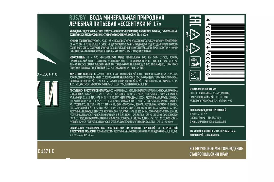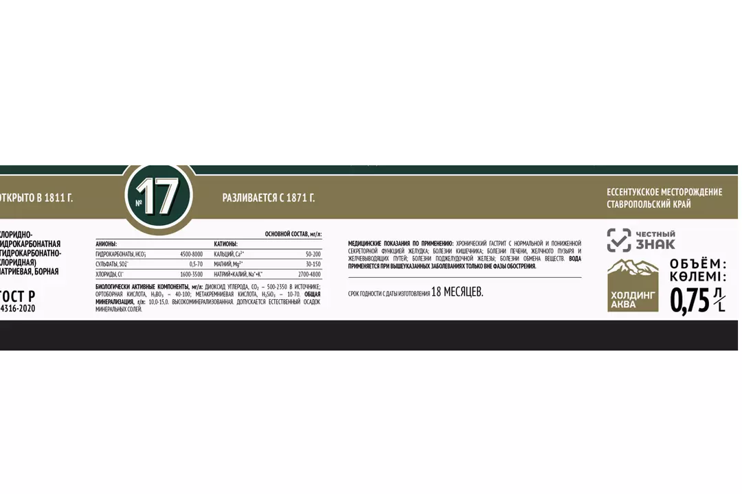 Легендарная вода из Ессентукских источников, находящихся на высоте 640 м над уровнем моря на территории эколого-курортного региона Кавказские Минеральные Воды. Имеет приятную газацию и насыщенный солоноватый вкус. Но главное в ней — повышенная минерализация. Дождевая и талая воды, просачиваясь через горные породы, обогащаются полезными веществами и газами. Природный напор в скважинах настолько силён, что вода «Ессентуки» выходит на поверхность самостоятельно с глубины более чем 200−1000 м. Уровень pH: 6,5–6,9. Благодаря богатому химическому составу, «Ессентуки №17» имеет лечебное назначение. Специалист может порекомендовать эту воду при хроническом гастрите, нарушенном обмене веществ, при болезнях кишечника, печени, желчного пузыря, желчевыводящих путей, поджелудочной железы. При перечисленных заболеваниях вода применяется только вне фазы обострения. pH 6,9. Страна-производитель Россия.