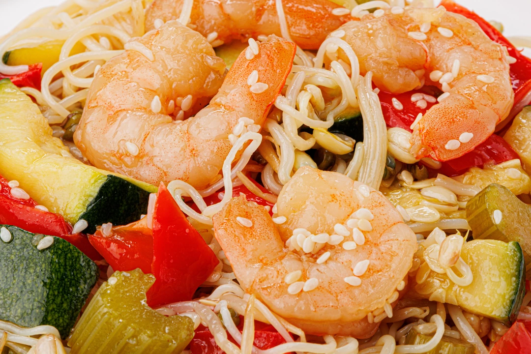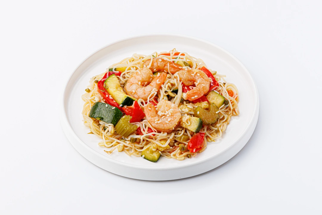 Лёгкое азиатское блюдо из фунчозы с морепродуктами и проростками фасоли. Креветки добавляют морской акцент, тушёные овощи — сочность, а кунжут и маш — приятный хруст. Во время бланширования маш слегка темнеет — в нём образуется ещё больше антиоксидантов, придающих ему цвет. Можно есть блюдо просто так или дополнить его несколькими каплями терияки, чтобы сделать этот вок ещё интереснее.