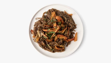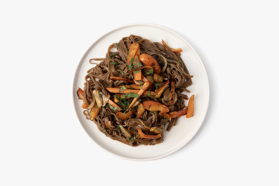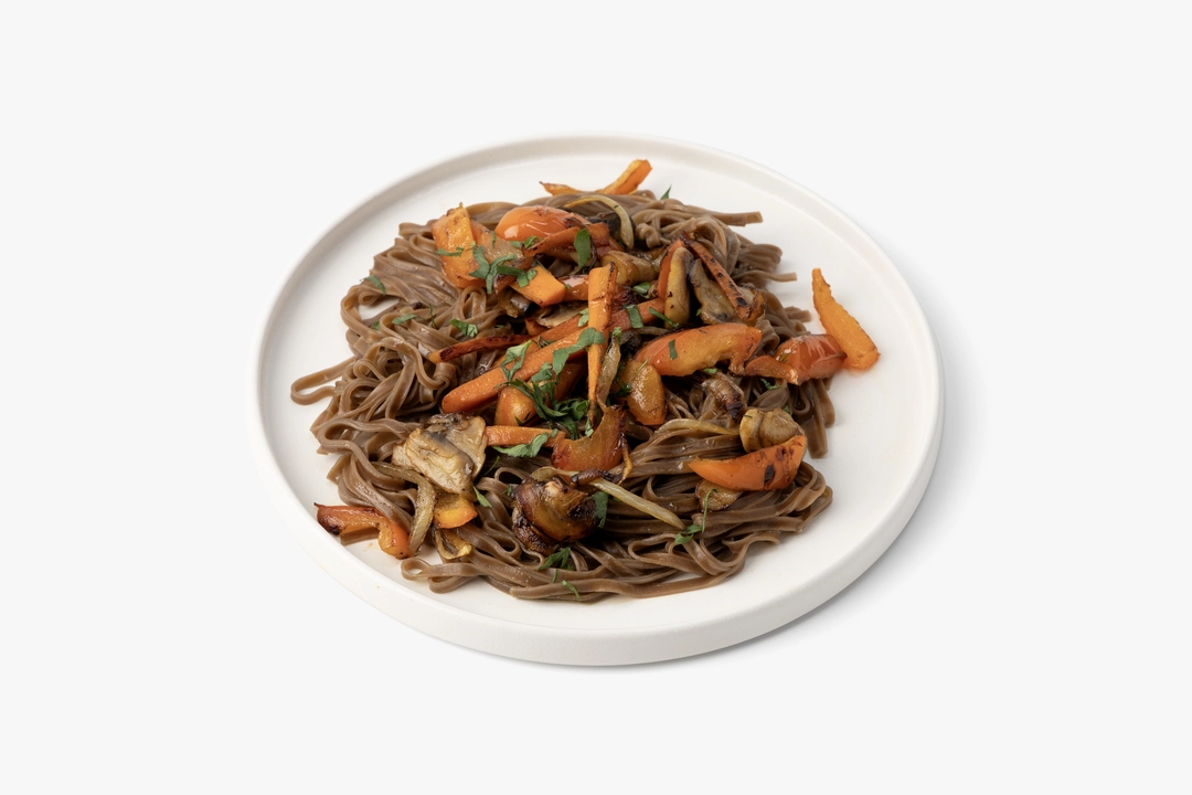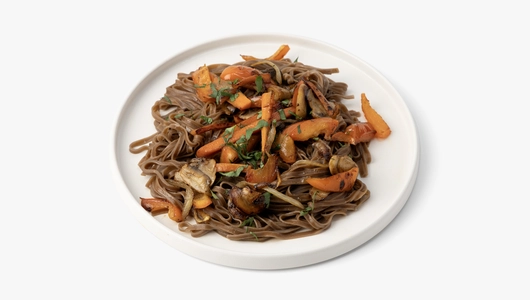 Соба — это традиционная японская лапша из гречневой муки. Мы нарезали шампиньоны, морковь и сладкий перец и добавили их к гарниру. Затем приготовили пряный кисло-сладкий соус на основе паприки и острого чили, чтобы он получился насыщенным, с узнаваемым азиатским акцентом, и перемешали все ингредиенты. Блюдо приготовлено по классическому вок-рецепту с быстрой обжаркой. Это готовый вариант лёгкого обеда или ужина, когда хочется чего-то острого и пикантного.