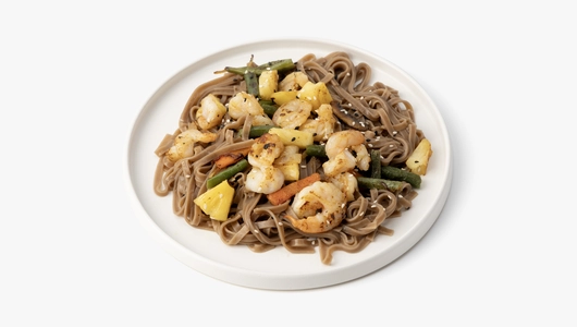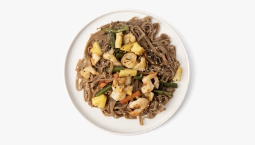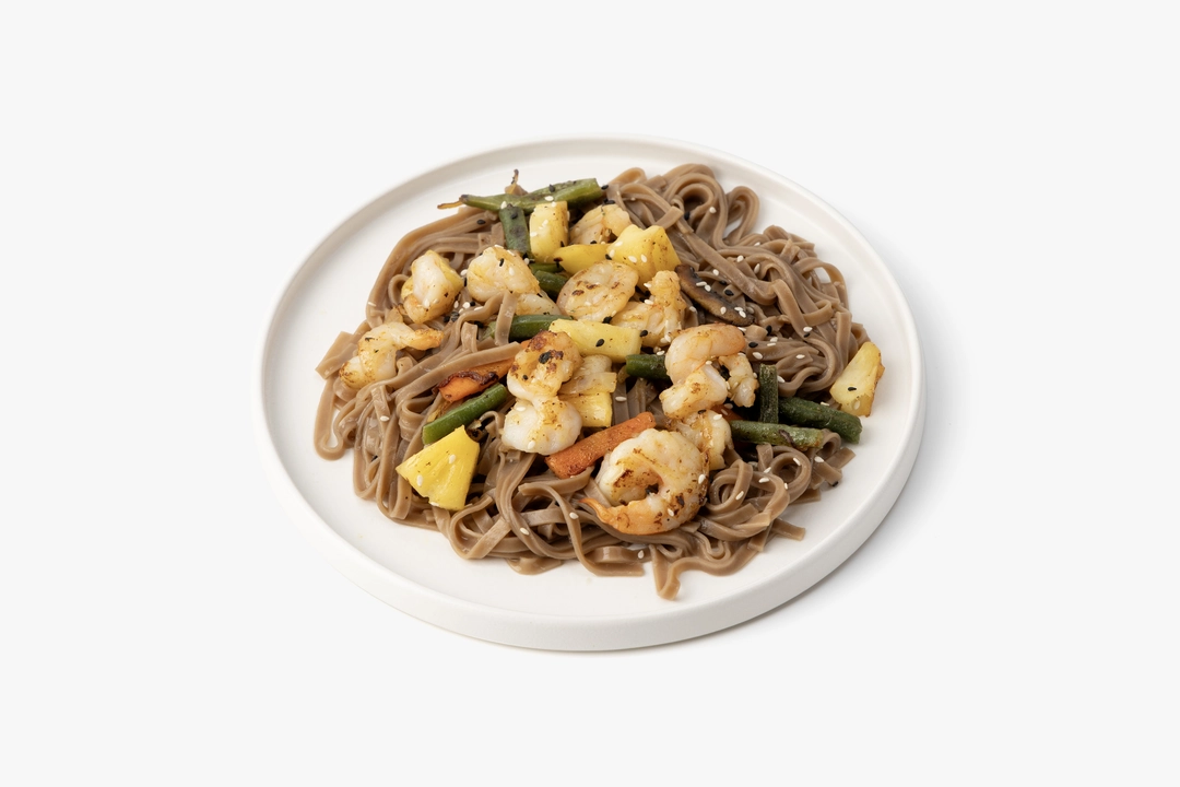 Гречневая лапша обжарена с королевскими креветками, овощами и ананасами в кисло-сладком соусе с лёгкой остротой. Соба хорошо впитывает все ароматы, креветки получаются аппетиными и упругими, а ананас добавляет яркую фруктовую ноту и балансирует остроту. Морковь, стручковая фасоль и лук делают блюдо более насыщенным, а смесь белого и чёрного кунжута завершает композицию текстурным акцентом. Такой вок получается сытным, но не тяжёлым и хорошо подойдёт для обеда или ужина. Доступно для самовывоза из магазинов с зоной кафе.
