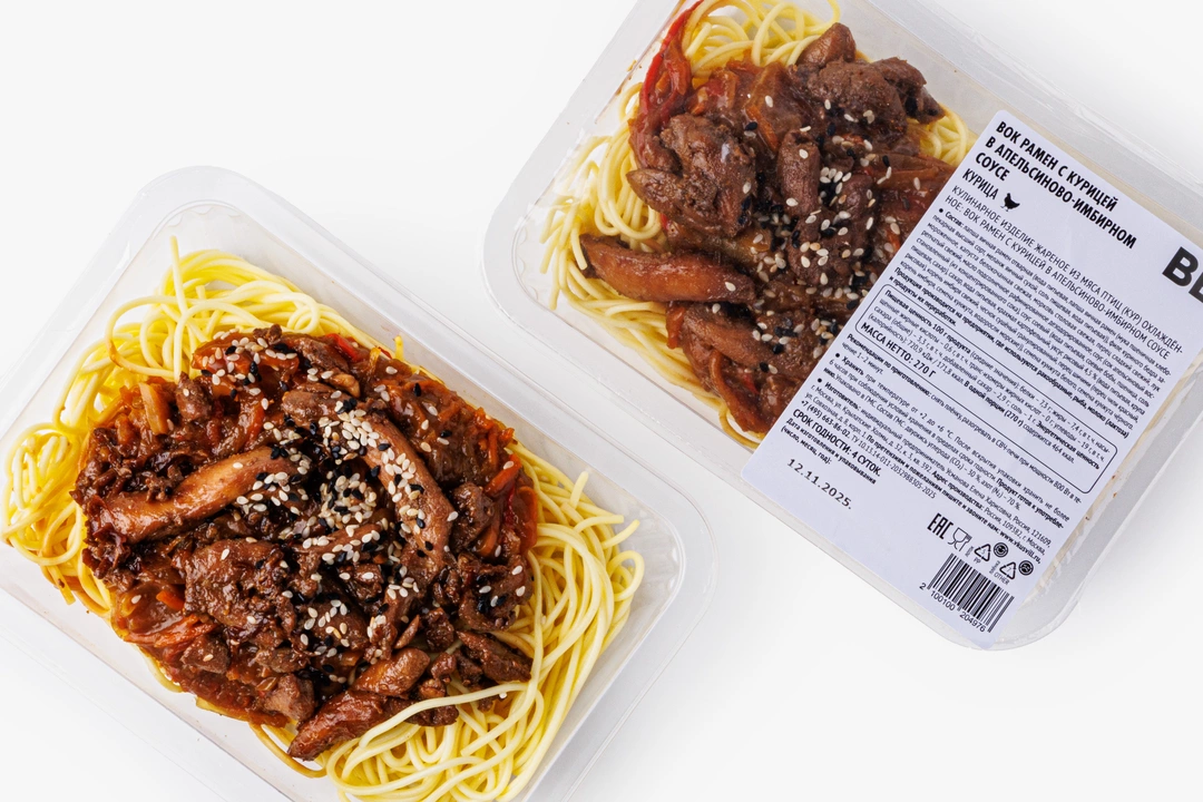 Вок рамен с курицей в апельсиново-имбирном соусе
