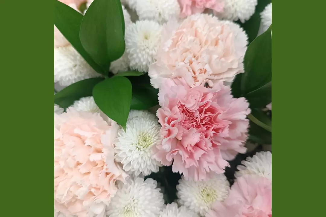 Наш букет очарует своей яркостью и нежностью. В нём собраны пушистые кустовые белые хризантемы в форме шариков, которые создают ощущение лёгкости и воздушности. Розовые гвоздики придают букету живость и радость, их яркий цвет гармонично сочетается с белыми хризантемами.Зелёные листья рускуса добавляют свежесть и динамику. Этот букет станет отличным подарком для дружеской встречи, праздника или просто чтобы поднять настроение 🩷 Состав Рускус - 5 шт. Гвоздика - 10 шт. Лента атласная - 1 шт. Упаковка дизайнерская - 1 шт. Ньютон хризантема - 5 шт.