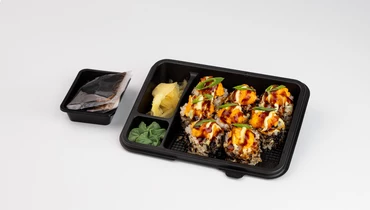 основа (водоросли Нори сушеные, рис (крупа рисовая отварная (вода питьевая, крупа рисовая шлифованная, соус для риса (уксус рисовый (уксус рисовый, уксус спиртовой, вода питьевая, сахар, соль пищевая), сахар, соль пищевая)), сыр творожный м.д.ж в сухом веществе 65% (творог (нормализованное пастеризованное молоко, бактериальная закваска, молокосвертывающий фермент микробного происхождения), загуститель- модифицированный крахмал, соль пищевая, стабилизаторы (камедь рожкового дерева, гуаровая камедь), регулятор кислотности лимонная кислота, вода питьевая), огурец свежий), спайс креветка (креветка отварная (креветка белоногая Litopenaeus vannamei (произведено из мороженого сырья, продукция аквакультуры), вода питьевая), соус спайс (майонез мдж 67% ( масло подсолнечное и масло оливковое рафинированное дезодорированное, вода питьевая, сахар, яичный желток жидкий, соль пищевая, лимонный сок прямого отжима, уксус спиртовой 20 %, горчичное мало нерафинированное), соевый соус (вода питьевая, соевые бобы, пшеница, соль, сахар), перец красный молотый)), соус васаби-лайм (майонез мдж 67% (масло подсолнечное и масло оливковое рафинированное дезодорированное, вода питьевая, сахар, яичный желток жидкий, соль пищевая, лимонный сок прямого отжима, уксус спиртовой 20 %, горчичное мало нерафинированное), порошок васаби (васаби порошок (порошок хрена, горчичный порошок, крахмал кукурузный, соль пищевая, антиокислитель-аскорбиновая кислота), порошок спирулины), сахарный сироп (сахарный песок, вода питьевая), сок лайма прямого отжима), соус унаги (вода, сахар, соус соевый (вода, соя, пшеница, соль, мука пшеничная), загуститель модифицированный крахмал, краситель пищевой сахарный колер 1 простой, консервант сорбат калия), жареный нори с кунжутом (морская капуста с кунжутом пхарэтольким (листья корейской порфиры Пхарэтольким 100%, масло подсолнечное рафинированное дезодорированное, масло кунжутное рафинированное, сахар, соль, семена кунжута сушеные), семена кунжута белые), лук зелены свежий, соус соевый (вода питьевая, соевый соус (вода питьевая, соевые бобы, пшеница, соль, сахар), сахар), имбирь маринованный (корень имбиря свежий, уксус рисовый (уксус рисовый, уксус спиртовой, соль, сахар), соль, сахар), васаби (вода питьевая, васаби порошок (порошок хрена, горчичный порошок, крахмал кукурузный, соль пищевая, антиокислитель-аскорбиновая кислота), порошок спирулины). Продукция производится на предприятии, где используются рыба, моллюски, ракообразные, яйца, молоко, кунжут, сельдерей, орехи, злаки и продукты их переработки. Возможно попадание в продукт фрагментов костей рыбы.