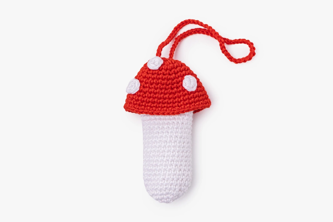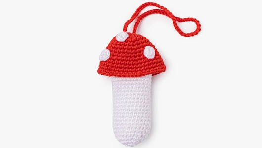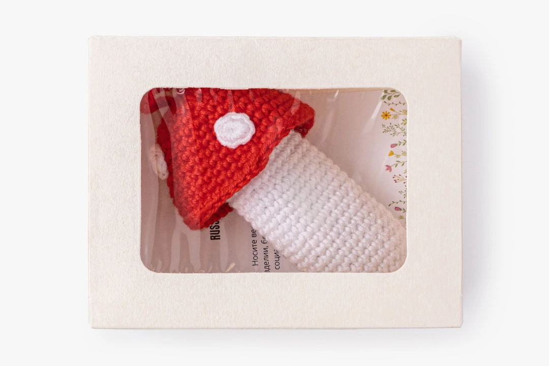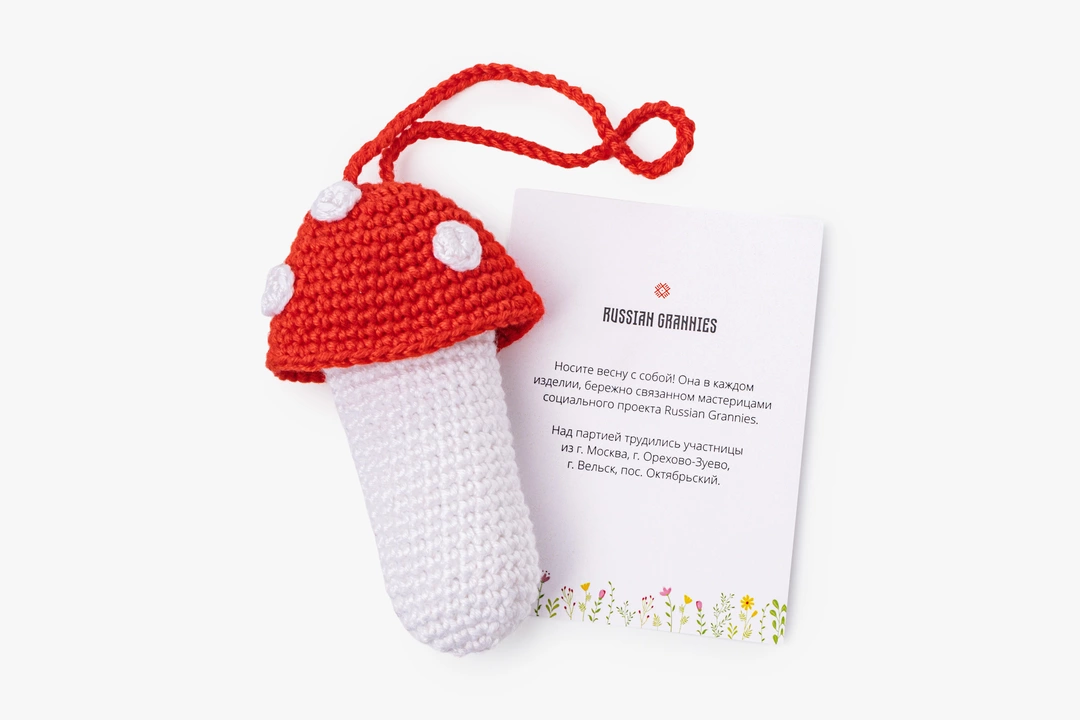 Этот вязаный грибок станет полезным аксессуаром, который не даст помаде потеряться. Его можно прикрепить к ключам или к сумке, чтобы нужная вещь была всегда под рукой. Мягкая смесь хлопка и акрила приятна на ощупь и держит форму даже при частом использовании. Яркая расцветка и пятнышки на шляпке вызывают улыбку и добавляют образу игривости. Брелок можно использовать и как самостоятельное украшение для рюкзака. Изделие связано руками мастеров старшего возраста проекта Russian Grannies. Его высота около 9 см.