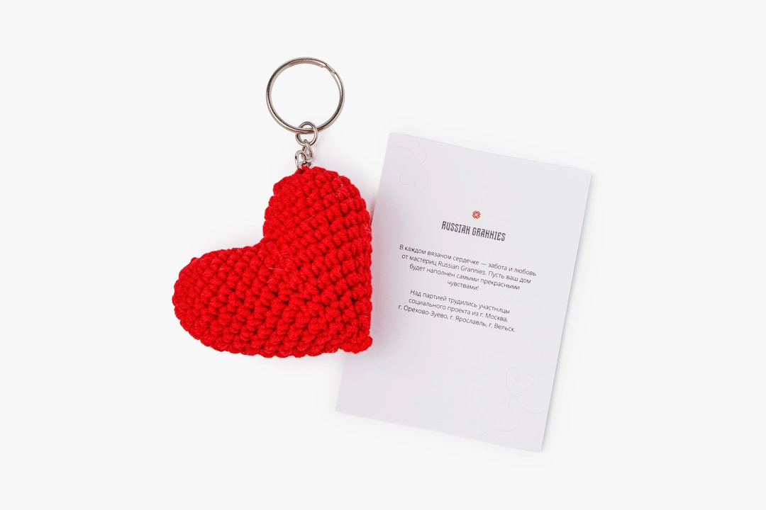 Маленький вязаный брелок в форме сердечка — тёплая и трогательная деталь, символизирующая заботу и тепло. Его удобно повесить на ключи, рюкзак или сумку, добавить к подарку как особый знак внимания. Фактурная вязка делает брелок приятным на ощупь и подчёркивает ощущение ручной работы. Связан руками мастеров старшего возраста проекта Russian Grannies. В составе 55 % хлопок и 45 % акрил, ширина 6,5 см, высота 5,5 см.