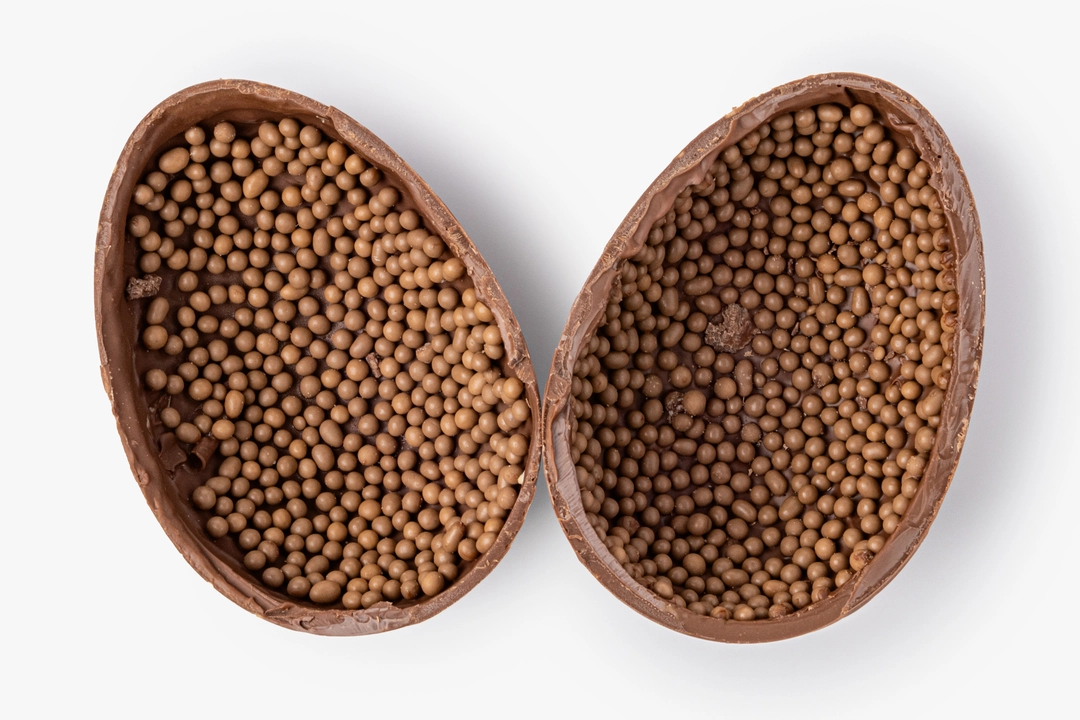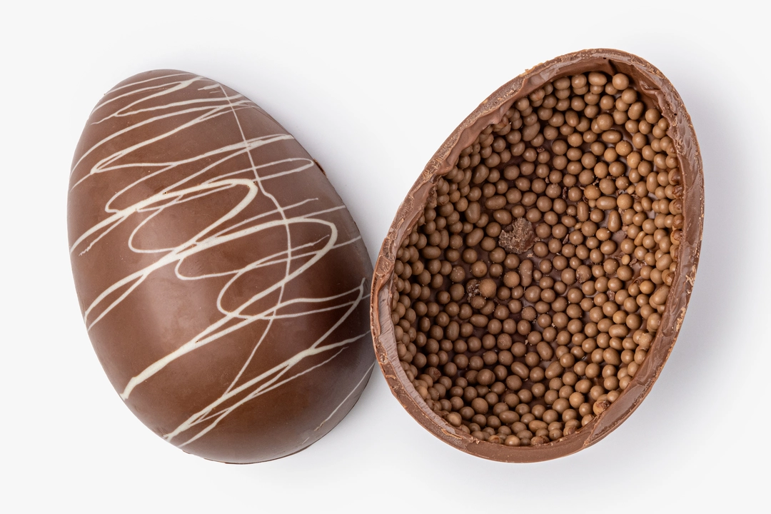 Большое шоколадное яйцо — это вариация традиционного пасхального угощения. Оно приготовлено из молочного шоколада с 33% какао и тёплым ванильным ароматом. Внутри фигурки карамельные шарики с хрустящими солёными хлопьями. Шоколадное яйцо можно подарить ребёнку или подать в качестве десерта к праздничному столу