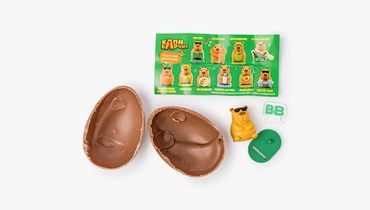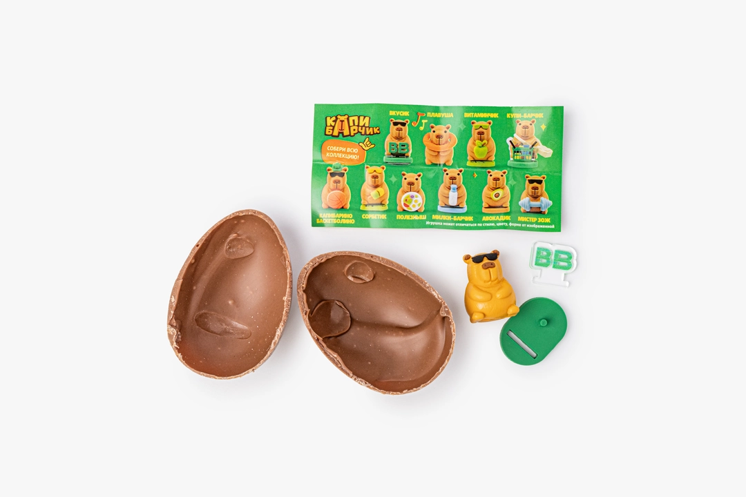 Шоколадное яйцо из классического молочного шоколада с тёплым ванильным ароматом. Внутри спрятана небольшая игрушка — одна из десяти капибар. Забавные персонажи помогут завести полезные привычки, с ними так легко и весело правильно питаться и заниматься спортом. Можно собрать целую коллекцию милых зверьков и разыгрывать с ними сценки. Дети найдут приятный сюрприз в каждом лакомстве.