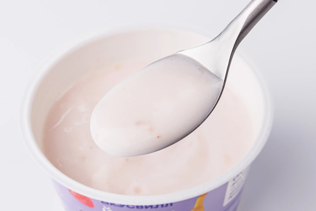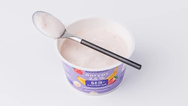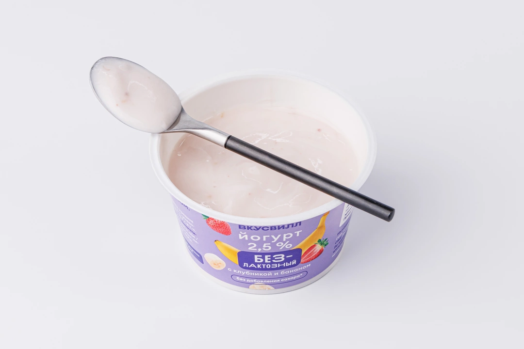 Нежный йогурт с фруктовым наполнителем приготовлен без добавленного сахара. Банан придаёт ему природную сладость, а клубника — ягодную кислинку. В составе йогурта препарат микробного происхождения, расщепляющий лактозу, — чтобы вы не отказывались от любимых продуктов, даже если избегаете употребления молока. Это хороший вариант для завтрака или лёгкого перекуса в течение дня.