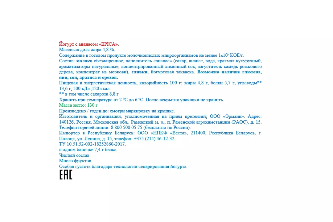 Йогурт Epica Ананас 4,8% 130 г / Супермаркет