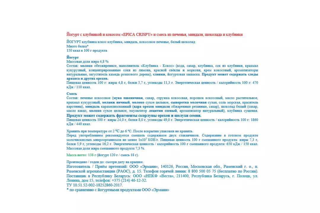 Необычайное сочетание вкусов — в линейке натуральных йогуртов! Epica Crispy предлагает насладиться сливочными оттенками йогурта, в основе которого обезжиренное молоко, сливки и закваска, дополненного натуральной крошкой из сушеной клубники, печенья с кокосом, лепестков карамелизованного миндаля и кусочков белого шоколада. Перед употреблением в пищу рекомендуется смешать все ингредиенты! Йогурт отлично подойдет для завтрака, в качестве дневного перекуса или легкого ужина.