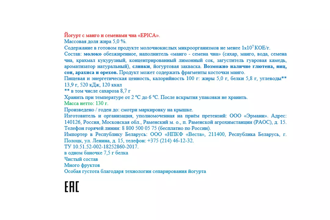 Йогурт Epica натуральный Манго семена чиа 5,0% 130 г / Супермаркет