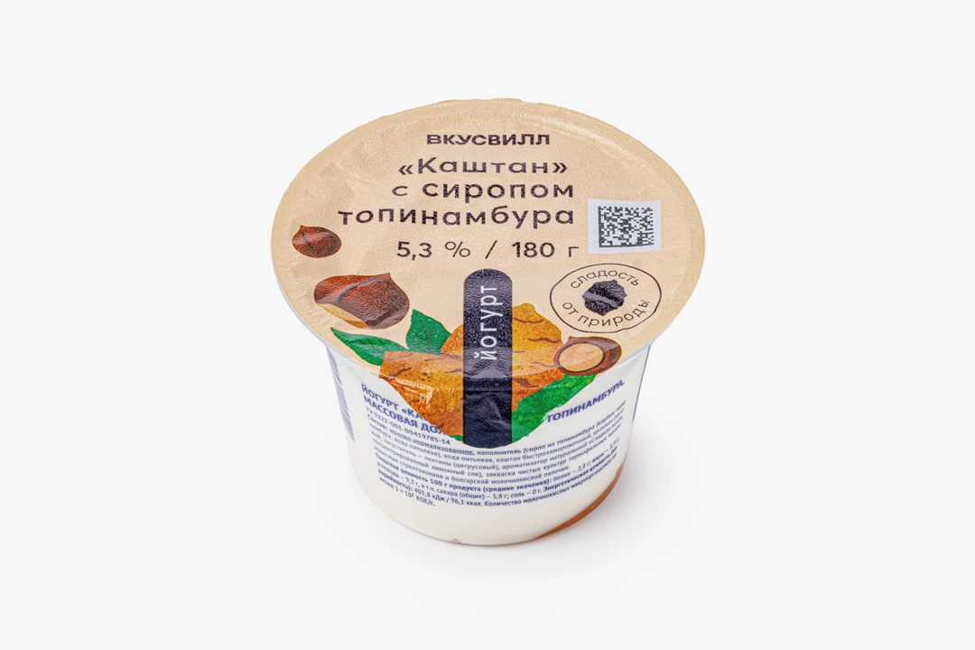 Густой йогурт с оригинальным вкусом каштана, подслащённый сиропом топинамбура. У него однородная консистенция с лёгкими ванильными нотами. Быстрозамороженный каштан придаёт десерту тонкий ореховый оттенок, а топинамбур — деликатную сладость. Это хороший вариант для завтрака или лёгкого перекуса в течение дня.