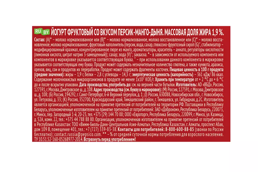 Йогурт питьевой Чудо Персик-манго-дыня 1,9% 260 г / Супермаркет