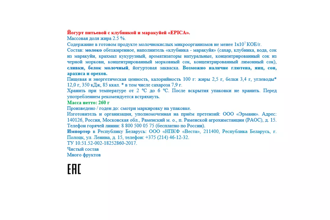 Питьевой йогурт с высоким содержанием белка надолго оставляет чувство сытости. Сладкая клубника и тропическая маракуйя дарят яркий экзотический вкус: попробуйте сами! Натуральные йогурты Epica - без консервантов и искусственных ароматизаторов. В составе только натуральное молоко и фрукты: поэтому йогурты не только вкусные, но и полезные. В каждой упаковке Epica в среднем 7,5 г белка - около 10% суточной нормы!