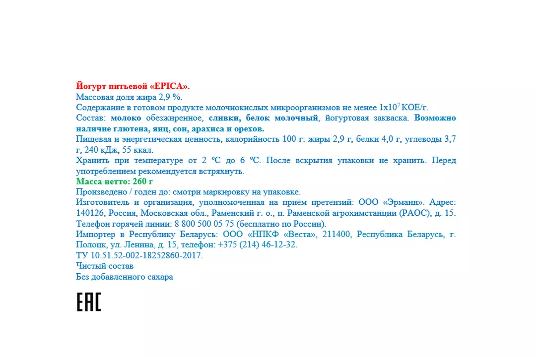 Йогурт питьевой Epica натуральный 2,9% 260 г / Супермаркет