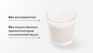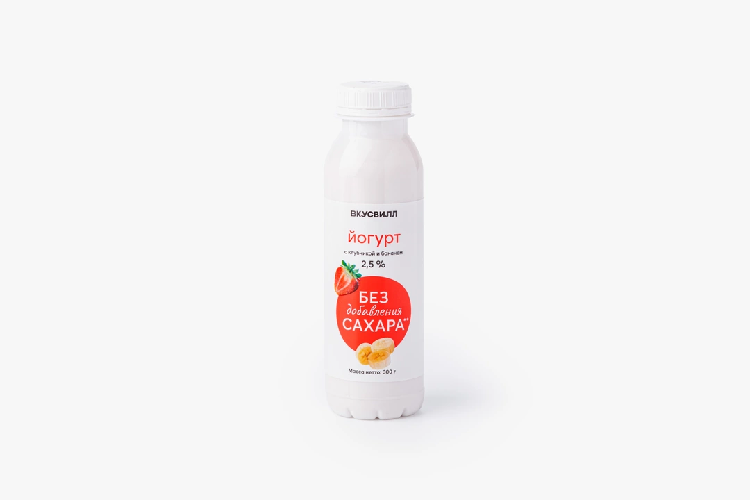Йогурт приготовлен из натурального молока и йогуртовой закваски без добавленного сахара. В нём нет искусственных ароматизаторов и усилителей вкуса, только натуральный фруктовый наполнитель из клубники и банана