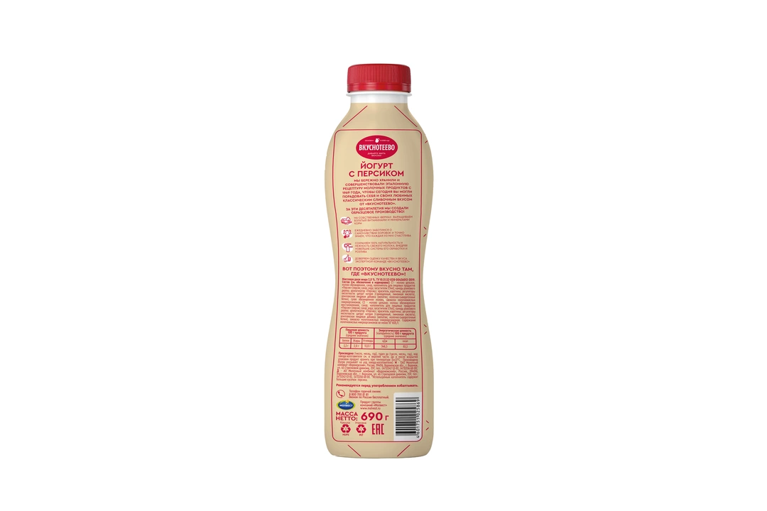 Питьевой йогурт «Вкуснотеево» с персиком — неизменная составляющая вкусной счастливой жизни и настоящее семейное лакомство. Особая технология производства и увеличенный процент жирности делают консистенцию йогурта еще более нежной и шелковистой, а за счет улучшенной рецептуры достигается богатый и насыщенный вкус. Выраженная густота йогурта и крупные кусочки фруктов делают его не просто вкусным, но и сытным. Именно поэтому питьевой йогурт «Вкуснотеево» идеально подойдет для завтрака, перекуса или позднего ужина всей семьи. Давайте жить вкусно! Страна-производитель Россия