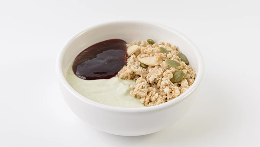 Йогурт с матчей, гранолой и малиновым вареньем