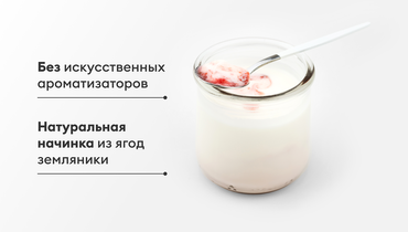 Йогурт приготовлен из обезжиренного молока и сливок. В составе настоящие ягоды земляники, а не вкусоароматические добавки.Не добавляем консервантов, красителей и усилителей вкуса