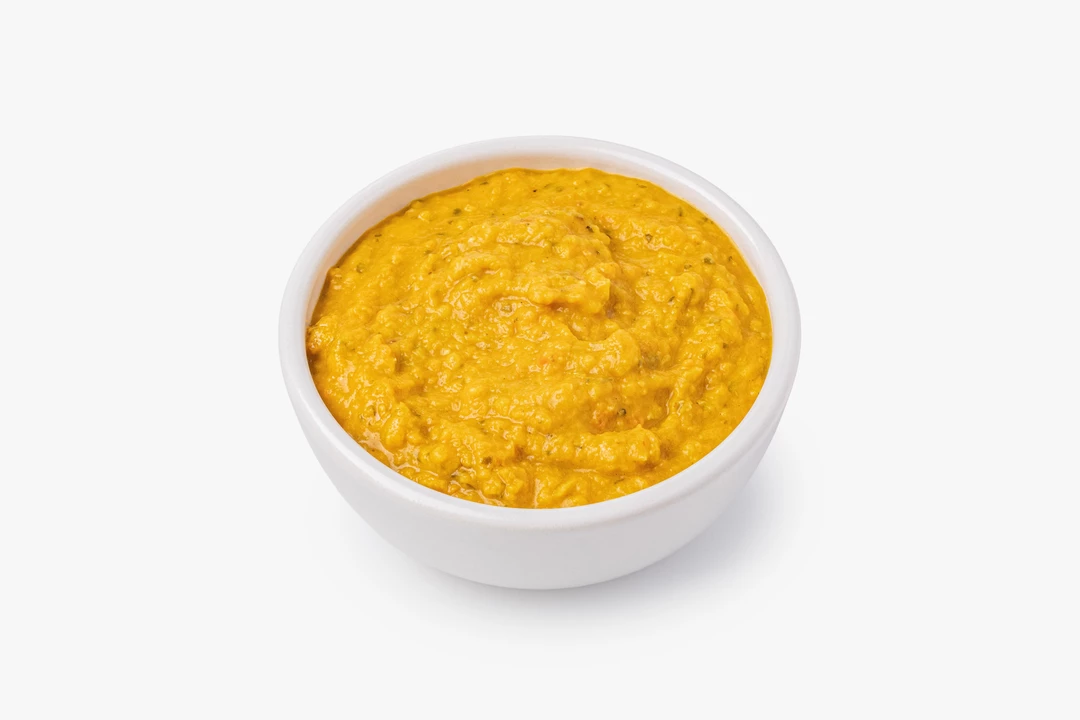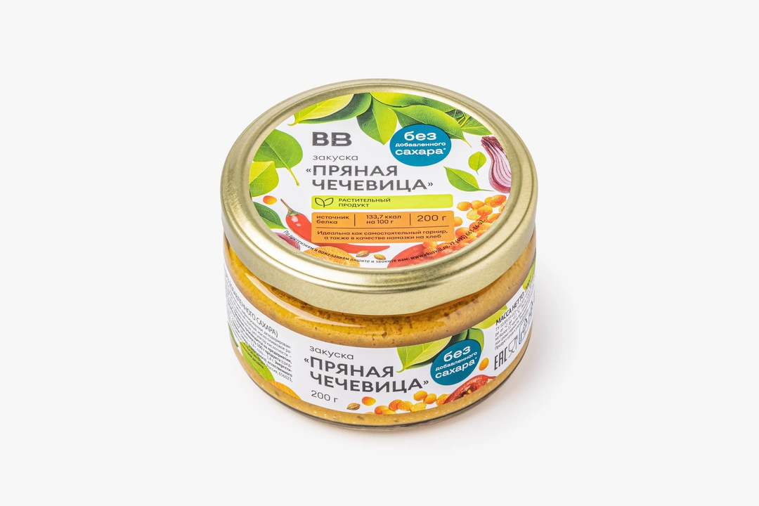 Густая овощная закуска на основе отварной красной чечевицы с пряным характером. Вкус складывается без использования добавленного сахара — его формируют натуральные ингредиенты и пряности: сушёные томаты, лук и морковь, имбирь, зира, кориандр, куркума и чили. Консистенция получается густой, но нежной — закуску удобно намазывать на тосты и лепёшки.