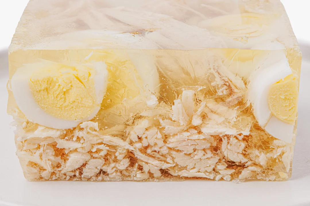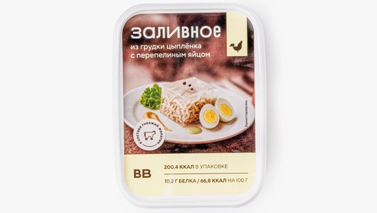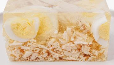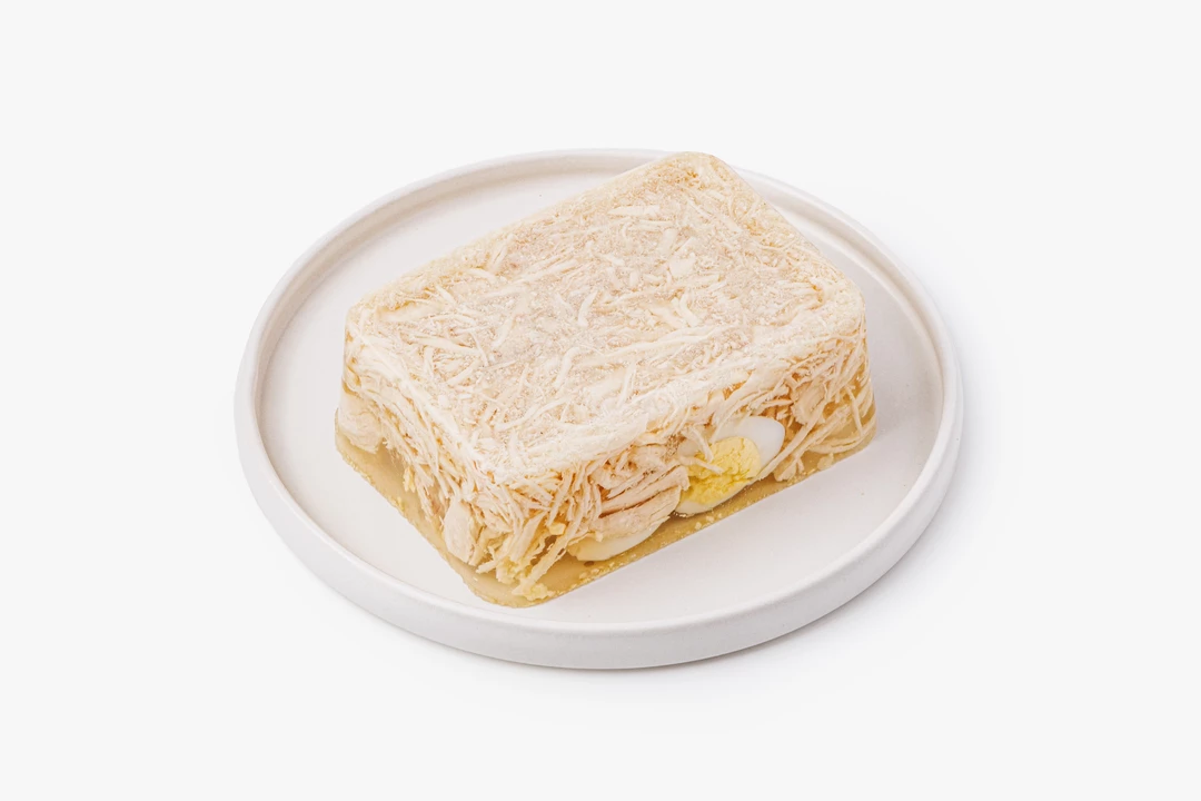Лёгкая и элегантная закуска с нежным вкусом. Прозрачное желе на основе куриного бульона с лавровым листом и чесноком обрамляет кусочки филе и миниатюрное яйцо, создавая красивый контраст текстур. Такой вариант подойдёт для праздничного стола или фуршета — заливное удобно нарезать порционными кусочками. Подавайте охлаждённым с горчицей или хреном.