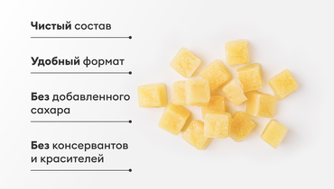 Небольшие кубики льда приготовлены из сока спелых лимонов с добавлением свежего имбиря. Без добавленного сахара, консервантов и красителей