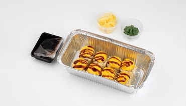 основа (водоросли Нори сушеные, рис (крупа рисовая отварная (вода питьевая, крупа рисовая шлифованная, соус для риса (уксус рисовый (уксус рисовый, уксус спиртовой, вода питьевая, сахар, соль пищевая), сахар, соль пищевая)), сыр творожный м.д.ж в сухом веществе 65% (творог (нормализованное пастеризованное молоко, бактериальная закваска, молокосвертывающий фермент микробного происхождения), загуститель- модифицированный крахмал, соль пищевая, стабилизаторы (камедь рожкового дерева, гуаровая камедь), регулятор кислотности лимонная кислота, вода питьевая), огурец свежий), крабовый сурими (крабовые палочки (фарш рыбный сурими (мясо морского леща, сахар), вода, крахмал кукурузный, масло подсолнечное рафинированное дезодорированное, соль, сахар, ароматизатор натуральный «Крабы», яичный белок жидкий, яичный желток сухой, красители – каротины (бета-каротин), экстракт паприки), майонез мдж 67% ( масло подсолнечное и масло оливковое рафинированное дезодорированное, вода питьевая, сахар, яичный желток жидкий, соль пищевая, лимонный сок прямого отжима, уксус спиртовой 20 %, горчичное мало нерафинированное)), соус сырный (майонез мдж 67% ( масло подсолнечное и масло оливковое рафинированное дезодорированное, вода питьевая, сахар, яичный желток жидкий, соль пищевая, лимонный сок прямого отжима, уксус спиртовой 20 %, горчичное мало нерафинированное), сыр Пармезан м.д.ж. в сухом веществе 32% (молоко нормализованное пастеризованное, бактериальная закваска мезофильных и термофильных молочнокислых организмов, соль поваренная пищевая, уплотнитель хлорид кальция, молокосвертывающий ферментный препарат животного происхождения), соус унаги (вода, сахар, соус соевый (вода, соя, пшеница, соль, мука пшеничная), загуститель модифицированный крахмал, краситель пищевой сахарный колер 1 простой, консервант сорбат калия), соус шрирача (перец чили 56%, чеснок, сахар, соль, очищенный уксус, стабилизатор ксантановая камедь), чеснок сушеный), семена белого кунжута, соус соевый (вода питьевая, соевый соус (вода питьевая, соевые бобы, пшеница, соль, сахар), сахар), имбирь маринованный (корень имбиря свежий, уксус рисовый (уксус рисовый, уксус спиртовой, соль, сахар), соль, сахар), васаби (вода питьевая, васаби порошок (порошок хрена, горчичный порошок, крахмал кукурузный, соль пищевая, антиокислитель-аскорбиновая кислота), порошок спирулины). Продукция производится на предприятии, где используются рыба, моллюски, ракообразные, яйца, молоко, кунжут, сельдерей, орехи, злаки и продукты их переработки. Возможно попадание в продукт фрагментов костей рыбы.
