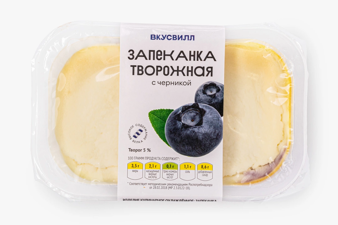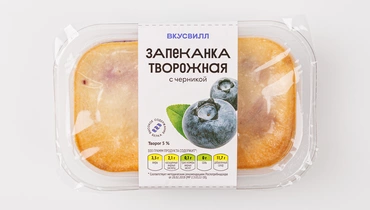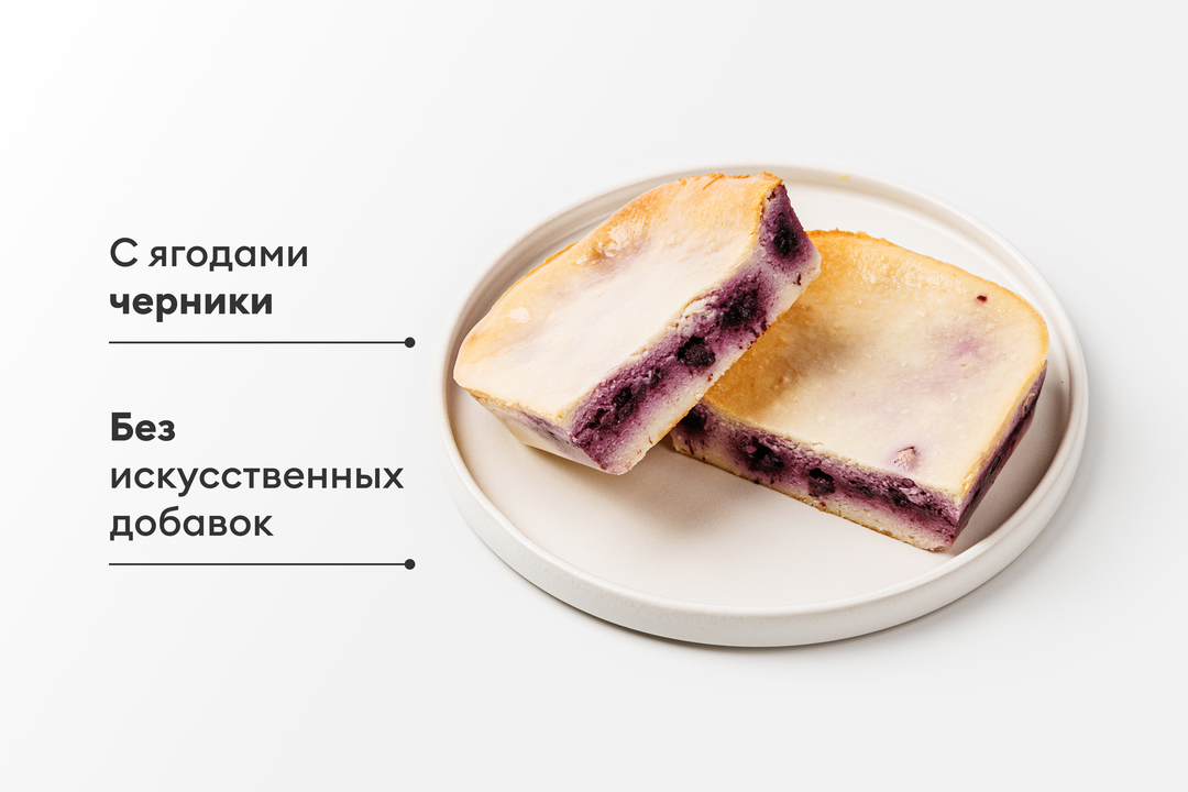 Нежная запеканка на твороге с ягодами черники. Подаётся в удобной порционной упаковке. Идеальна для завтрака и перекуса. По желанию вы можете добавить к ней варенье, сгущённое молоко или любой другой наполнитель. Вкусно, как дома!