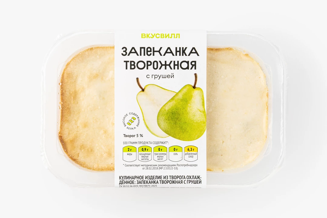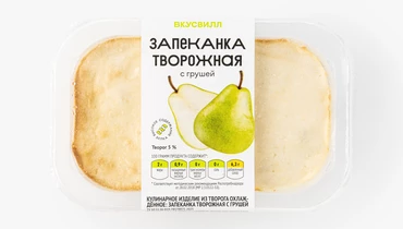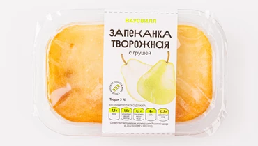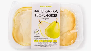 Нежная запеканка на твороге с кусочками свежей груши. Подаётся в удобной порционной упаковке. Идеальна для завтрака и перекуса. По желанию вы можете добавить к ней варенье, сгущённое молоко или любой другой наполнитель. Вкусно, как дома!
