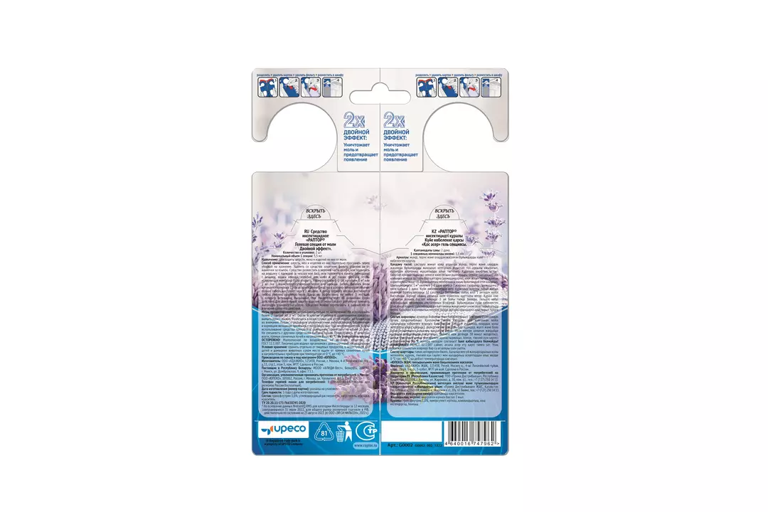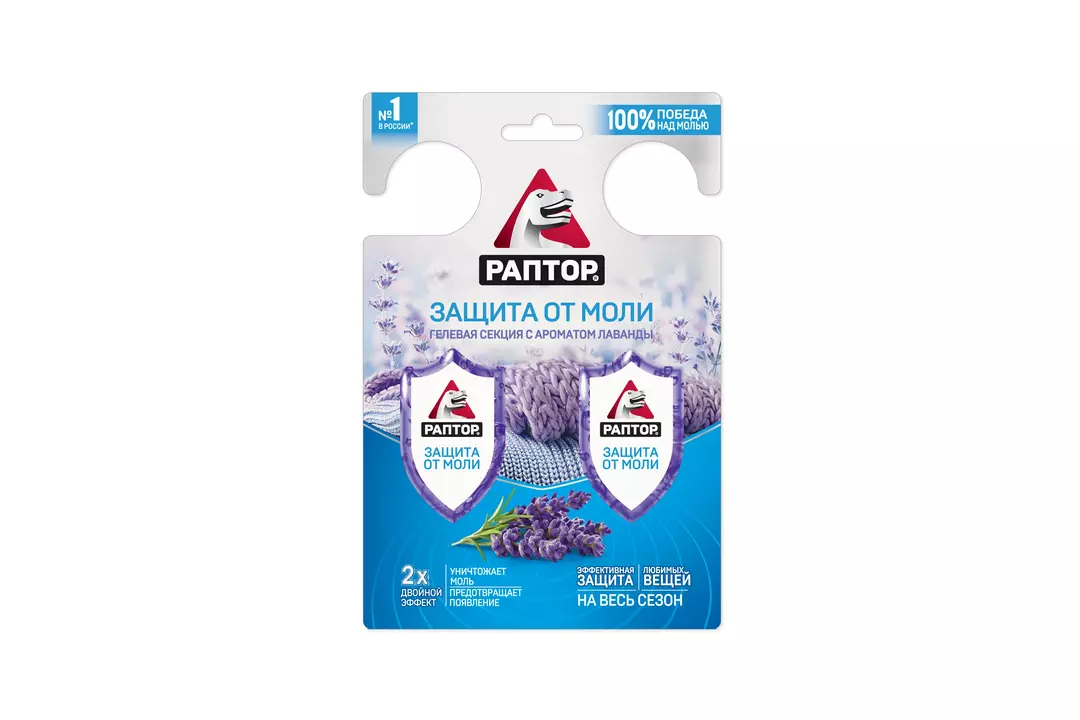 Защитите свои любимые вещи от моли!Сохранить уютные шерстяные свитера, элегантные кашемировые пальто, невесомые пуховики, роскошные шубы и шапки из натурального меха в их первозданном виде - непростая задача!Когда другие средства от моли не помогают, на выручку приходит гелевая секция РАПТОР!Видимый результат уже с первого дня применения!Благодаря эффективной формуле, разработанной для борьбы с молью и профилактики её появления, гелевая секция РАПТОР Двойной эффект с лёгкостью уничтожит не только моль, но и её личинки! Плюс подарит вам 4 месяца надёжной защиты от прожорливых насекомых!Разделите секцию на две части по линии перфорации и разложите в ящиках для хранения вещей или повесьте в шкафу или гардеробной комнате.Приятное дополнение - лёгкий аромат лаванды наполнит всё вокруг едва уловимым дыханием французского Прованса…Вот увидите - ваши вещи будут вам благодарны и с удовольствием продолжат обнимать, согревать и украшать вас ещё не один сезон!Секрет популярности гелевой секции от моли РАПТОР Двойной эффект:- Эффективная формула для борьбы с молью и её личинками + профилактика появления новых особей- Содержит активное действующее вещество - трансфлутрин- Видимый эффект с первого дня использования- Удобная форма - можно положить в ящик или повесить в шкаф - Приятный аромат лаванды. Россия