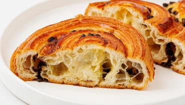 Слоёное тесто закручено в спираль и выпечено до румяной корочки. Внутри заварной крем на молочной основе и шоколад с ванильным акцентом. Снаружи завиток получается слегка хрустящим, а его серединка — мягкой и пористой. Крем делает текстуру более сочной и добавляет лёгкую сладость. Выпечку удобно взять с собой в качестве перекуса. Это вкусное дополнение к горячему утреннему кофе или ароматному вечернему чаю.