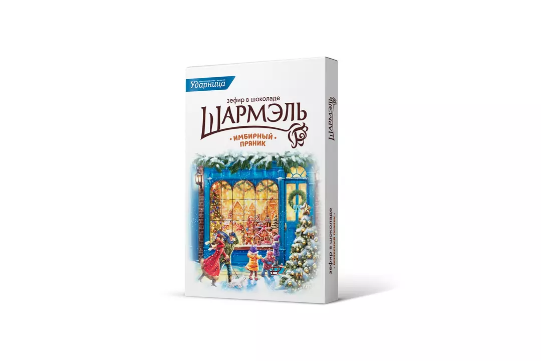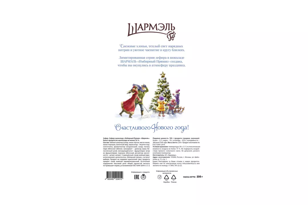 Нежный воздушный зефир с пряными нотками имбирного пряника в благородном темном шоколаде – изысканный десерт с новогодним настроением! Приятно проникнуться атмосферой праздника и насладиться любимым лакомством в кругу друзей и родных! ШАРМЭЛЬ – искусство баловать себя и близких! Страна производитель-Россия