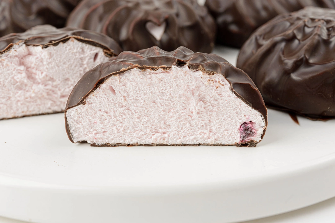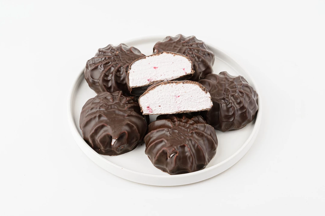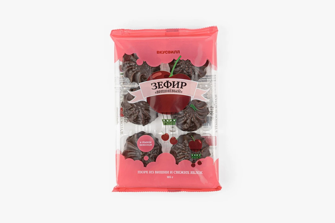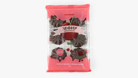 Натуральный воздушный зефир, облитый тёмным шоколадом. В его основе пюре из свежих яблок и вишни, которое придаёт лакомству яркую фруктовую кислинку с лёгкой терпкостью, а кусочки сублимированной вишни добавляют интересный акцент. Тёмный шоколад с горьковатыми нотами какао мягко оттеняет сладость начинки. Зефир хорошо сочетается с чёрным чаем или зерновым кофе, его можно подать в качестве десерта или взять несколько штук с собой для сладкой паузы в течение дня.