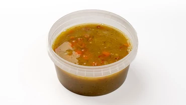 Ароматный суп из зеленого горошка с говяжьими щечками, копчено-вареным окороком и полукопченой колбасой, сдобреный картофелем, морковью, репчатым луком, шпинатом, душистым чесноком и специями.