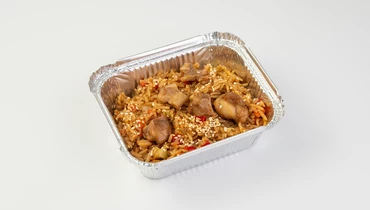 Это блюдо — идеальный баланс текстур и ярких вкусов Востока. Нежное филе куриного бедра, обжаренное во фритюре до готовности дополняет рассыпчатый, благородный рис басмати с его характерным тонким ароматом. Овощной ансамбль из сладкого болгарского перца, сочной моркови и молодых кабачков наполняет блюдо свежестью и цветом, а густой пряный соус обволакивает каждый ингредиент, соединяя их в единую симфонию с легкой пикантностью и глубоким ароматом специй.